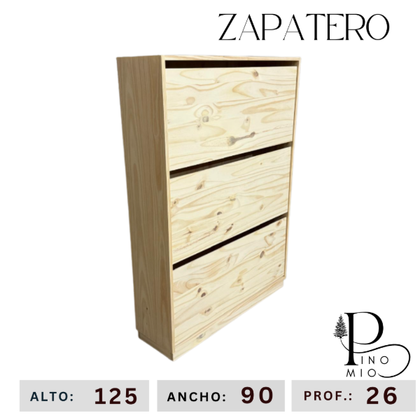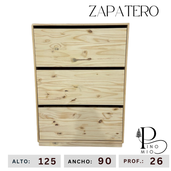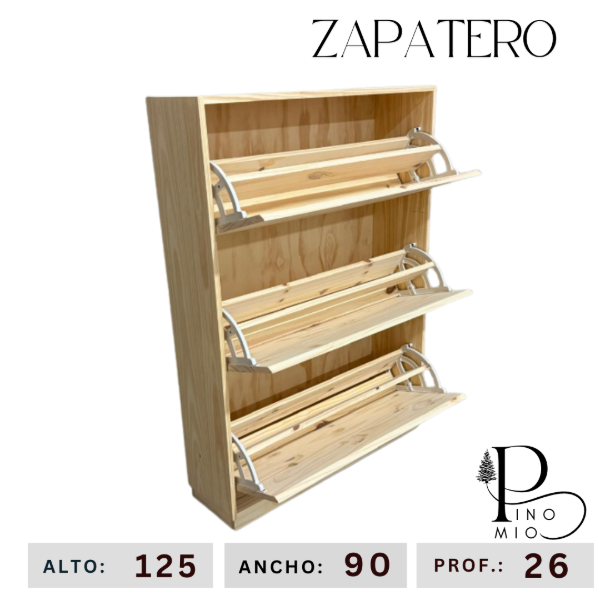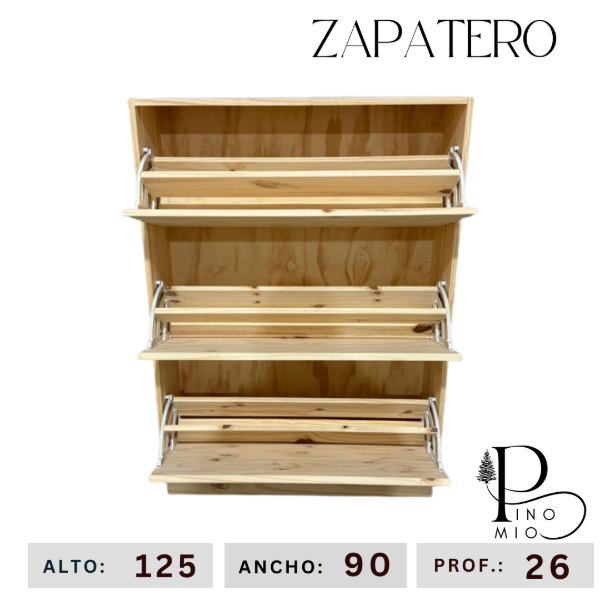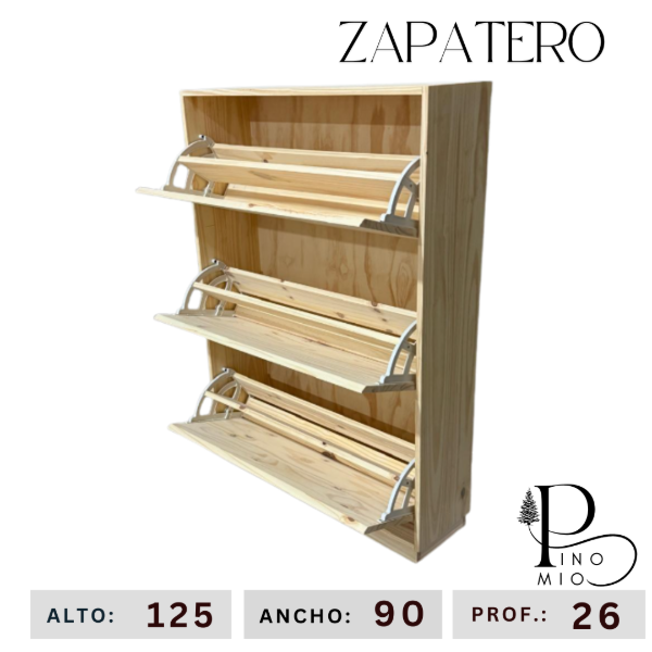 Ahorrá espacio con este zapatero para 18 pares aproximadamente, práctico y funcional. La madera de pino es con nudos y vetas. Se entrega masillado y lijado, listo para pintar.