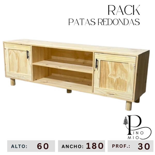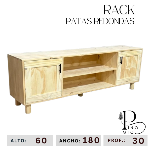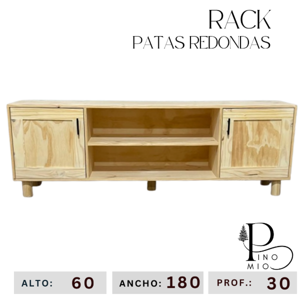 Rack con puertas y patas redondas, hermoso y exclusivo modelo. Se entrega masillado y lijado, listo para pintar. La madera de pino es con nudos y vetas.
